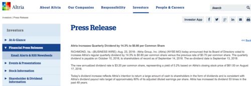 連続増配,高配当株として人気のアルトリア(MO). 米国内での紙タバコ消費の先細り,ニコチン規制,電子タバコの許認可など先行きに対する不透明感から,株価は低迷していますが,配当はすくすくと成長し続けています. うれしいことに2018年,2回目の増配…